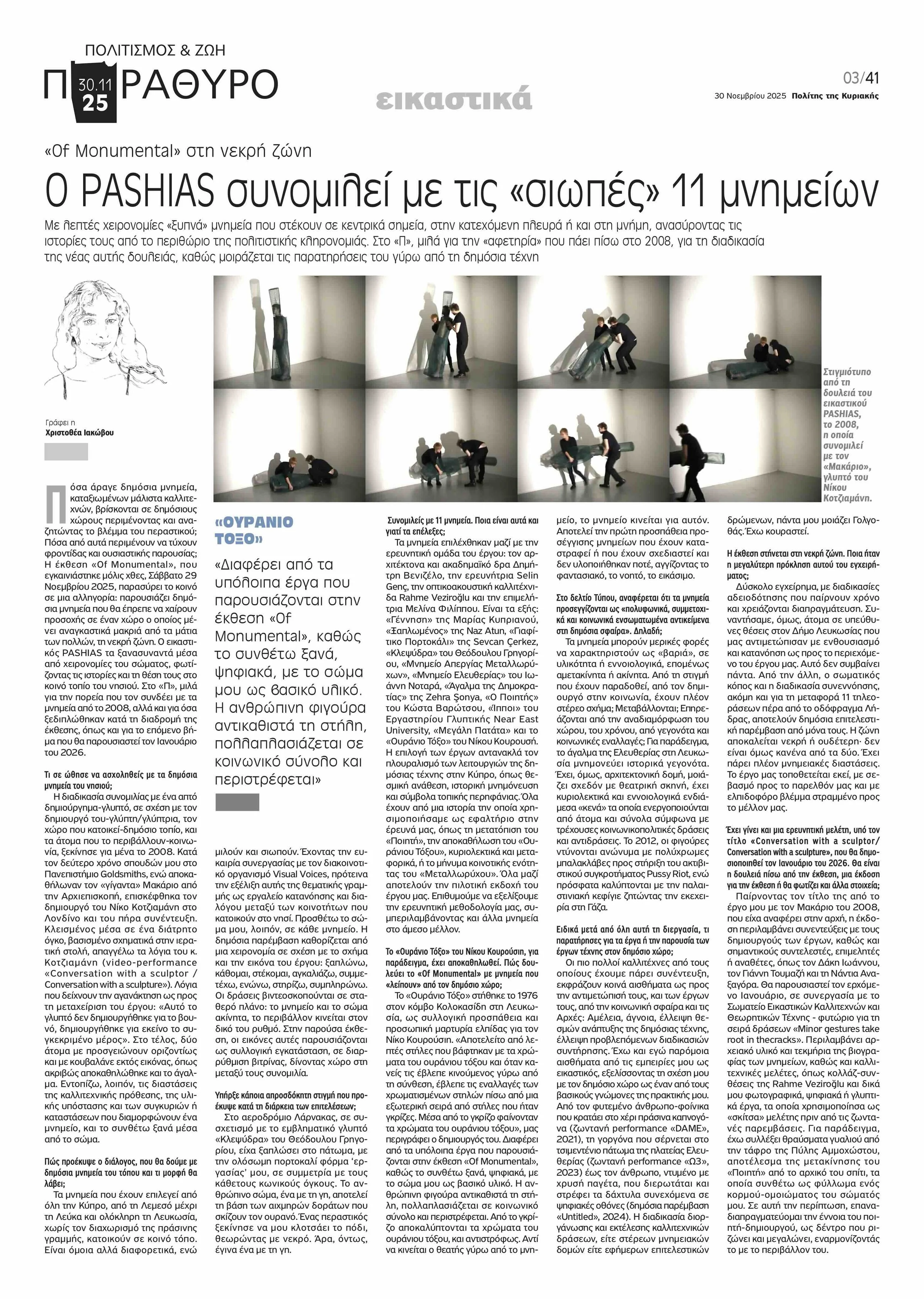 How many public monuments - by acclaimed artists, no less - stand in public spaces, waiting and searching for the gaze of the passerby? How many of them await care and genuine presence? The exhibition "Of Monumental", inaugurated on Saturday, 29 November 2025, draws the public into an allegory: it presents public monuments that should receive attention, yet in a space that is necessarily removed from the eyes of most - the Buffer Zone. Visual artist PASHIAS encounters them anew, through gestures of the body, illuminating their histories and their place in our island’s shared landscape. Speaking to "P", he describes the trajectory that has tied him to monuments since 2008, the unfolding of the exhibition’s methodologies, and the next steps, to be presented in January 2026.
