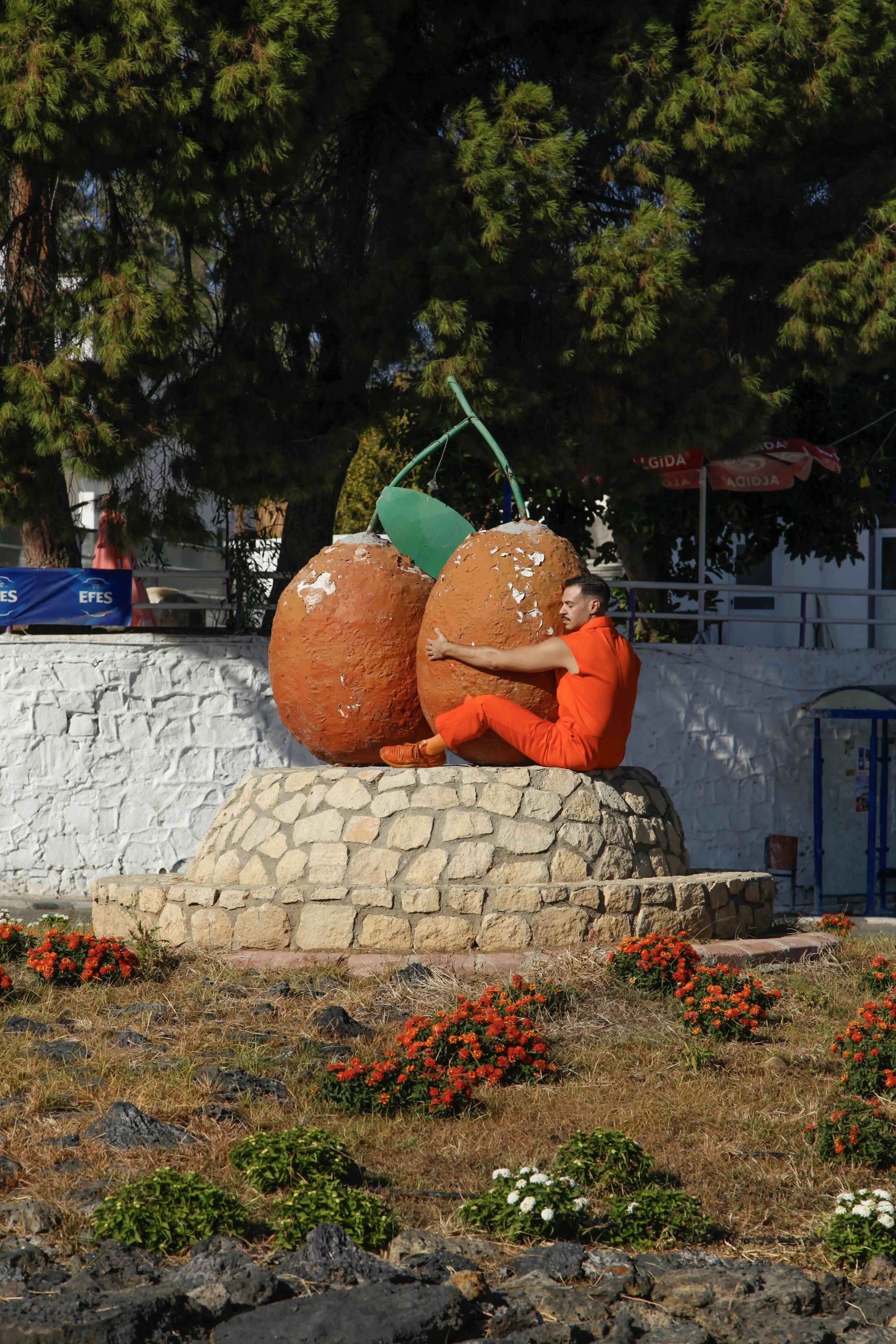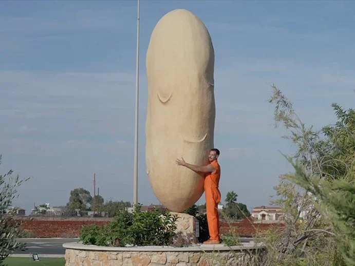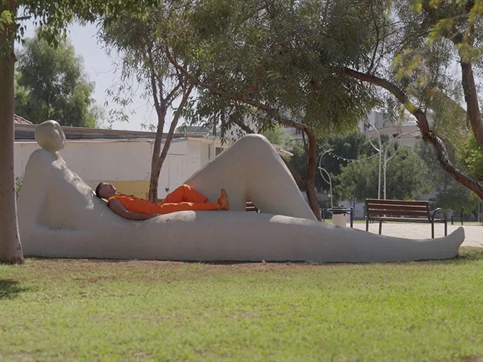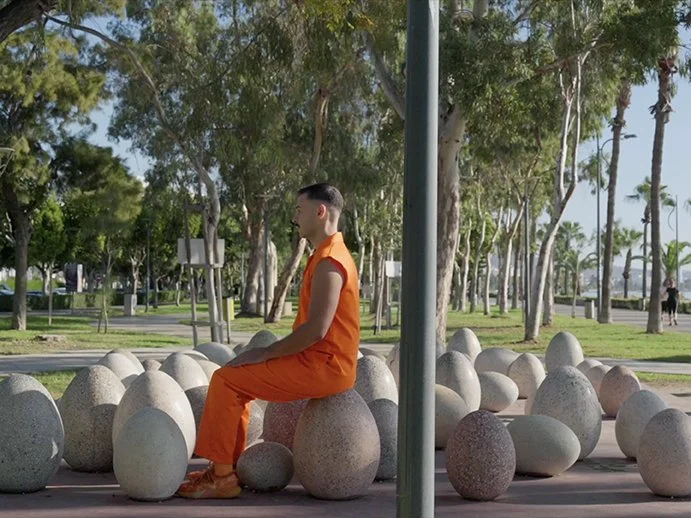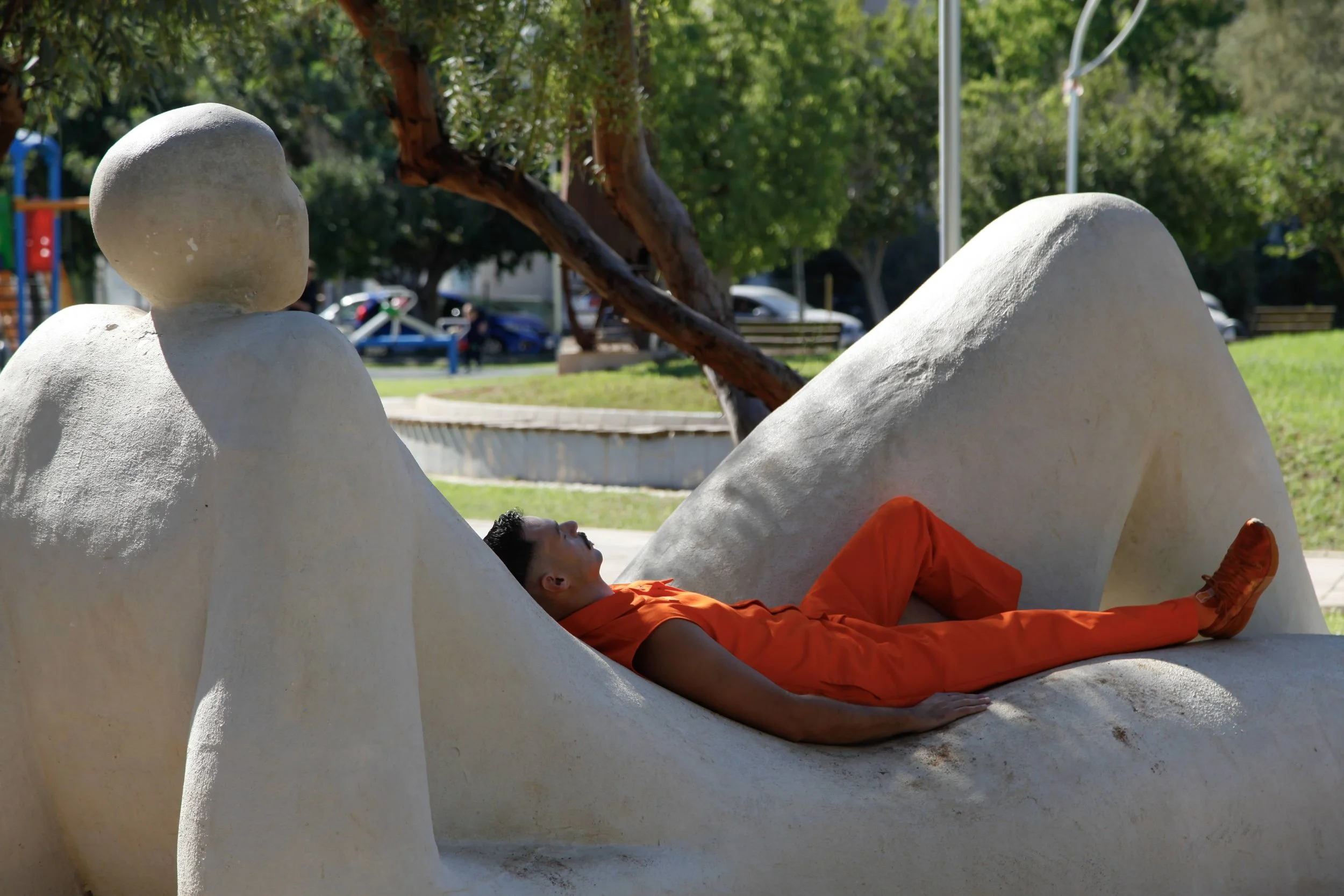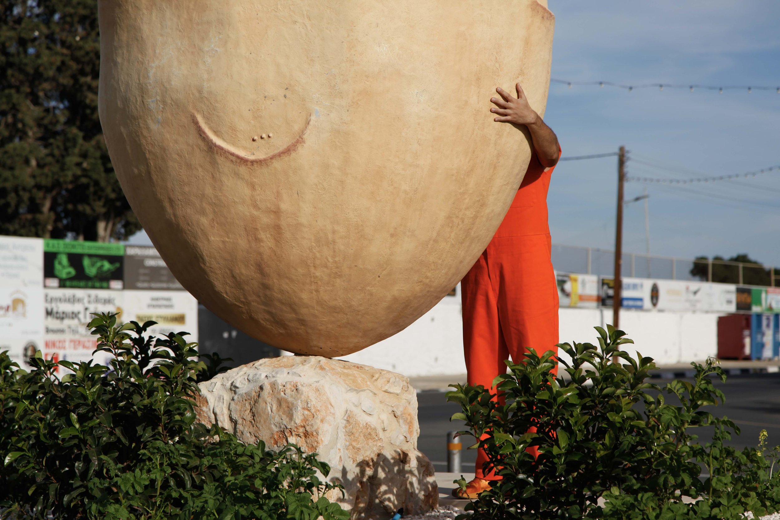 Confronting "The Poet", a sculpture that is characterized as both fragile and aggressive, he neither imitates nor opposes its sharpness. Instead, he adopts the figure as a shield, entering into a conversation with Varotsos’ creative tension between vulnerability and force. Engaging Cyprus’ celebrated non-pedigreed public art landmarks, PASHIAS addresses their contested reception. At the "Jaffa Orange", his intimate embrace counters both the public’s initial rejection and the sculpture artist’s own discomfort with its reception. With closed eyes echoing the 'eyelids' of the Spunta potato, PASHIAS personifies the wounded object and gently restores its dignity. At "Birth" and "Lying Down", the artist rests in stillness. In alignment to Naz Atun’s intentions, he embraces leisure as a formative practice that traverses and overlays political contestations across the island.
