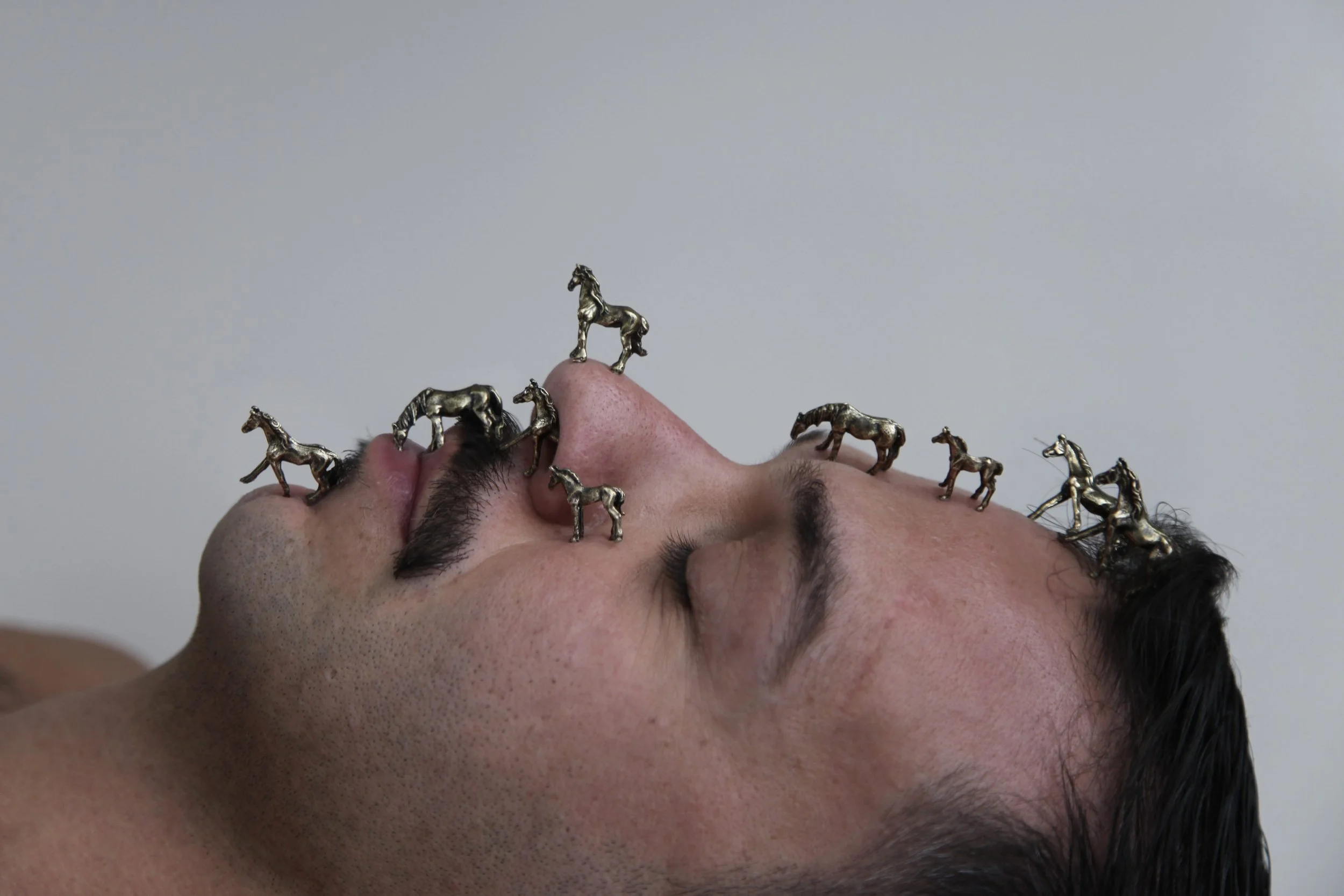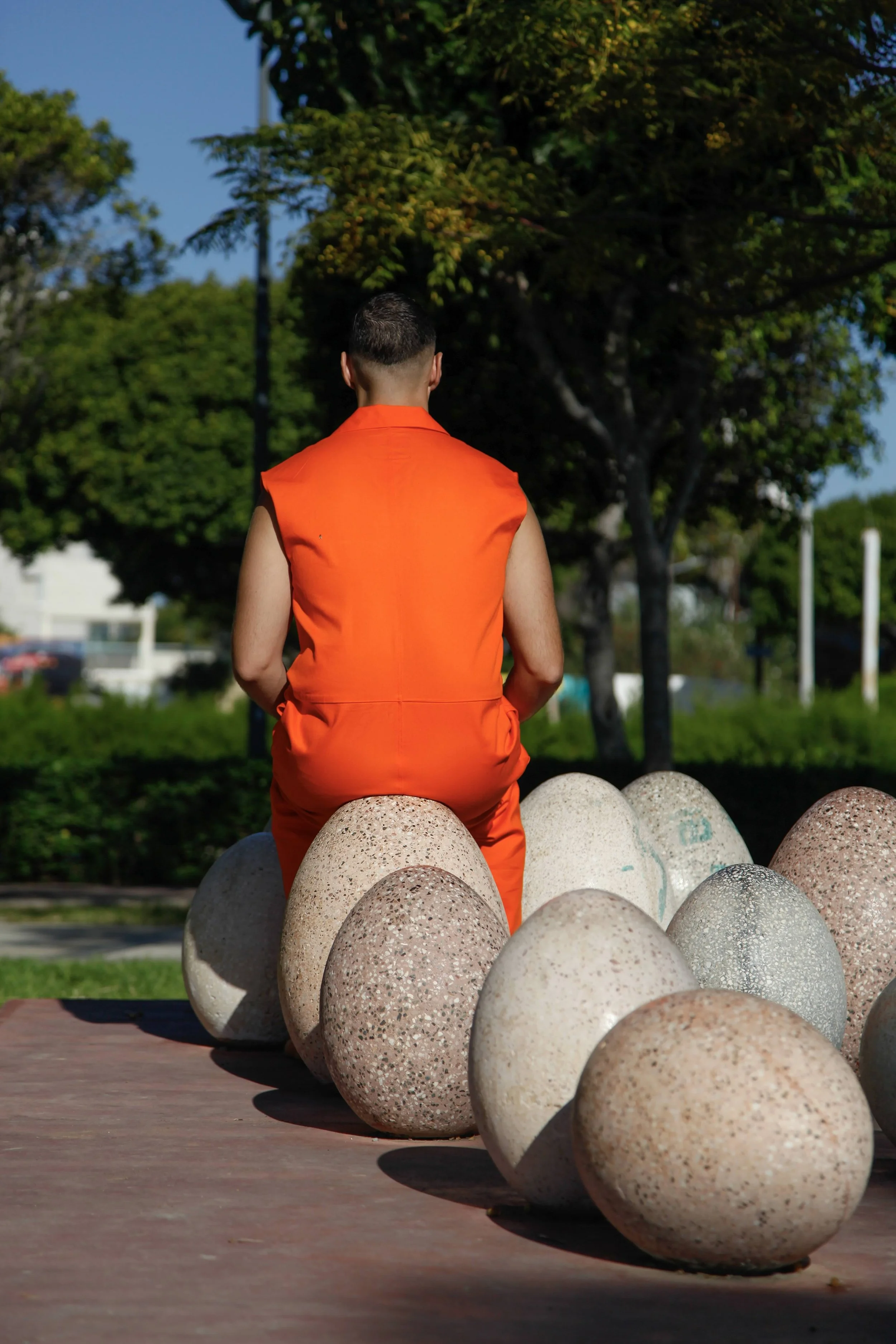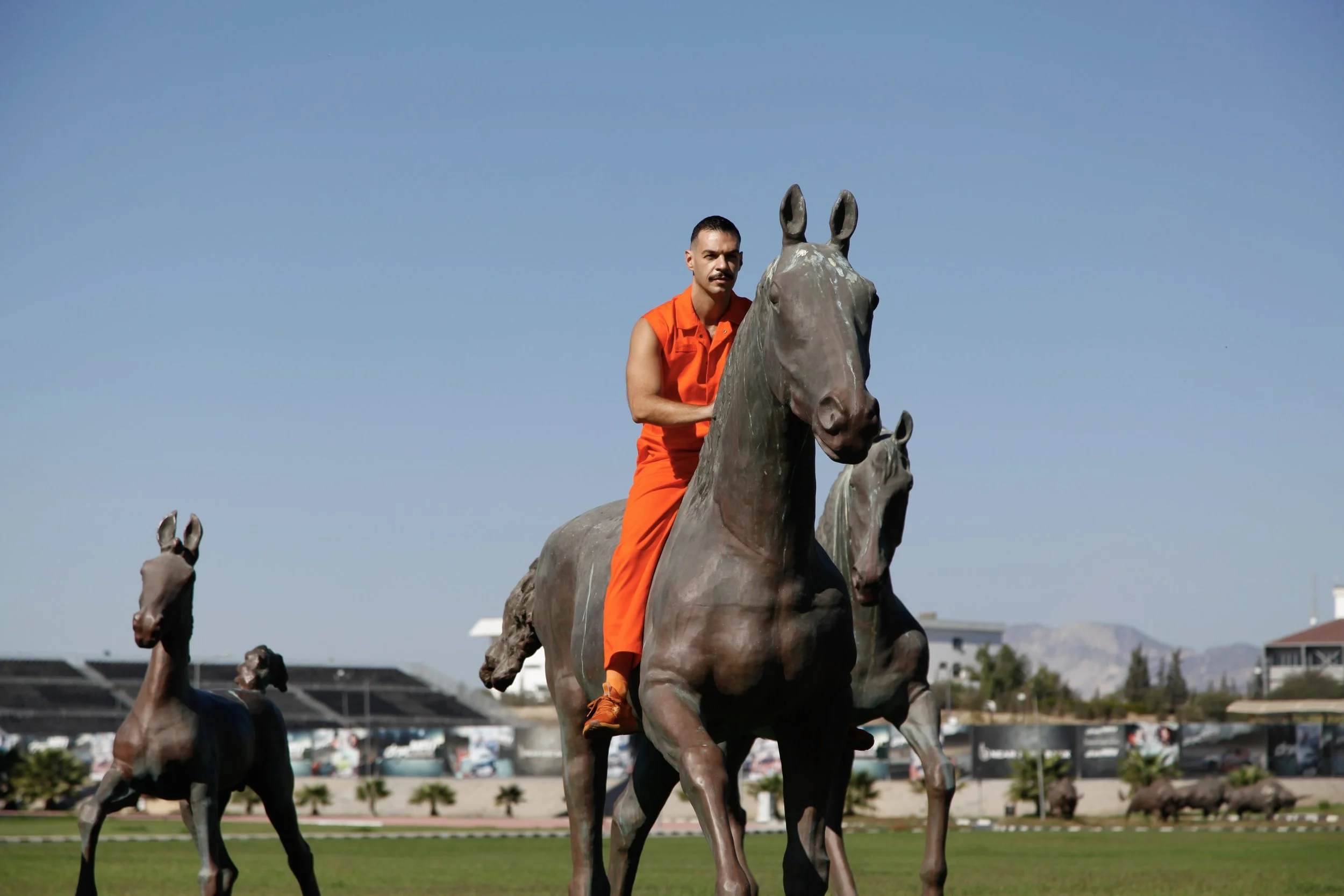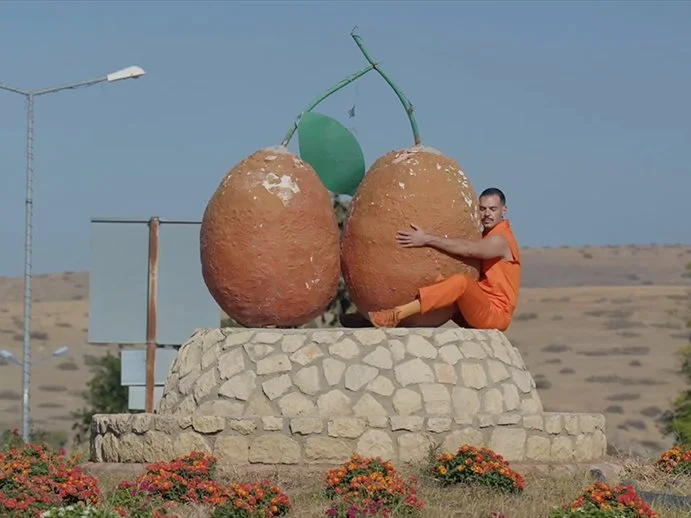 Confronting "The Poet", a sculpture that is characterized as both fragile and aggressive, he neither imitates nor opposes its sharpness. Instead, he adopts the figure as a shield, entering into a conversation with Varotsos’ creative tension between vulnerability and force. Engaging Cyprus’ celebrated non-pedigreed public art landmarks, PASHIAS addresses their contested reception. At the "Jaffa Orange", his intimate embrace counters both the public’s initial rejection and the sculpture artist’s own discomfort with its reception. With closed eyes echoing the 'eyelids' of the Spunta potato, PASHIAS personifies the wounded object and gently restores its dignity. At "Birth" and "Lying Down", the artist rests in stillness. In alignment to Naz Atun’s intentions, he embraces leisure as a formative practice that traverses and overlays political contestations across the island.