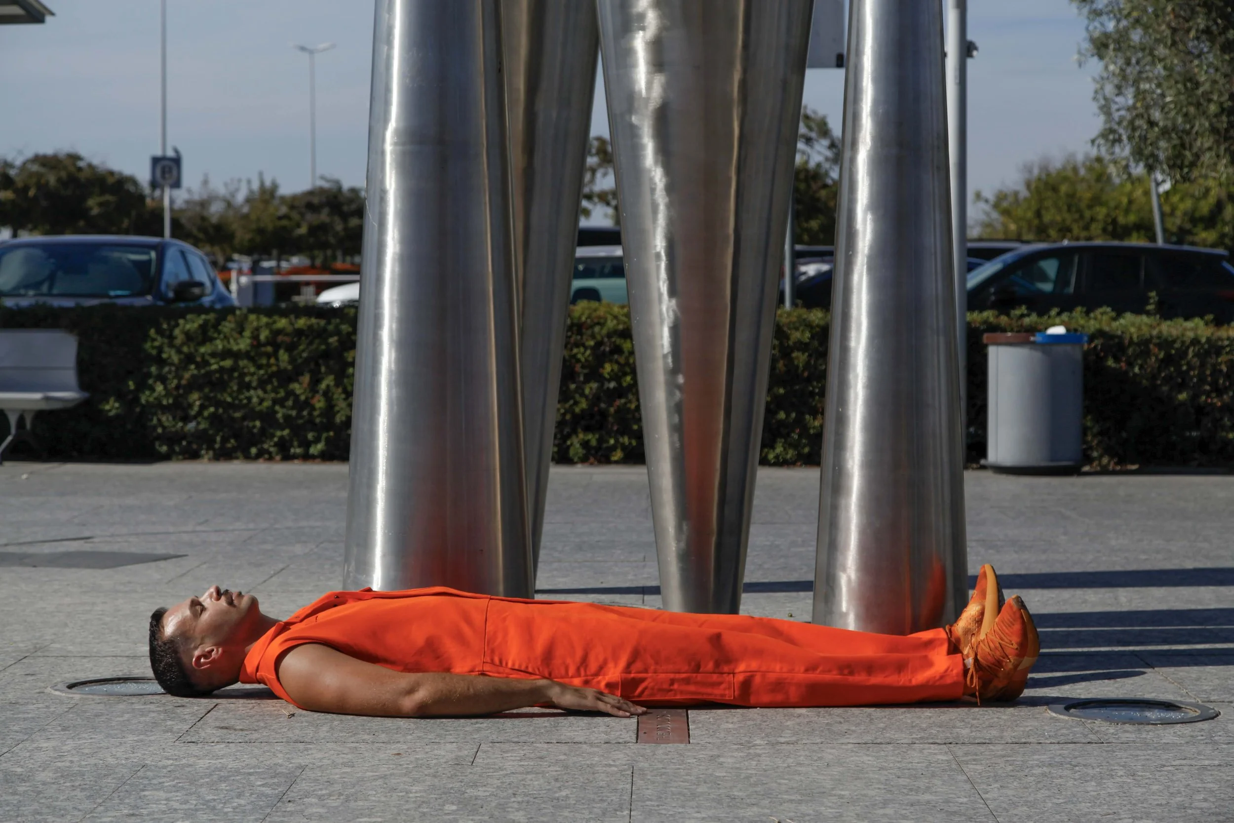 P: At the Larnaca Airport, in relation to the emblematic sculpture "Clepsydra" by Theodoulos Gregoriou, I lay down on the floor in my orange worker’s suit, in symmetry with the vertical and conical volumes. The human body, one with the earth, becomes the base of sharp spears piercing the sky. A passerby started kicking my leg, thinking I was dead. Indeed, then, I became one with the earth.