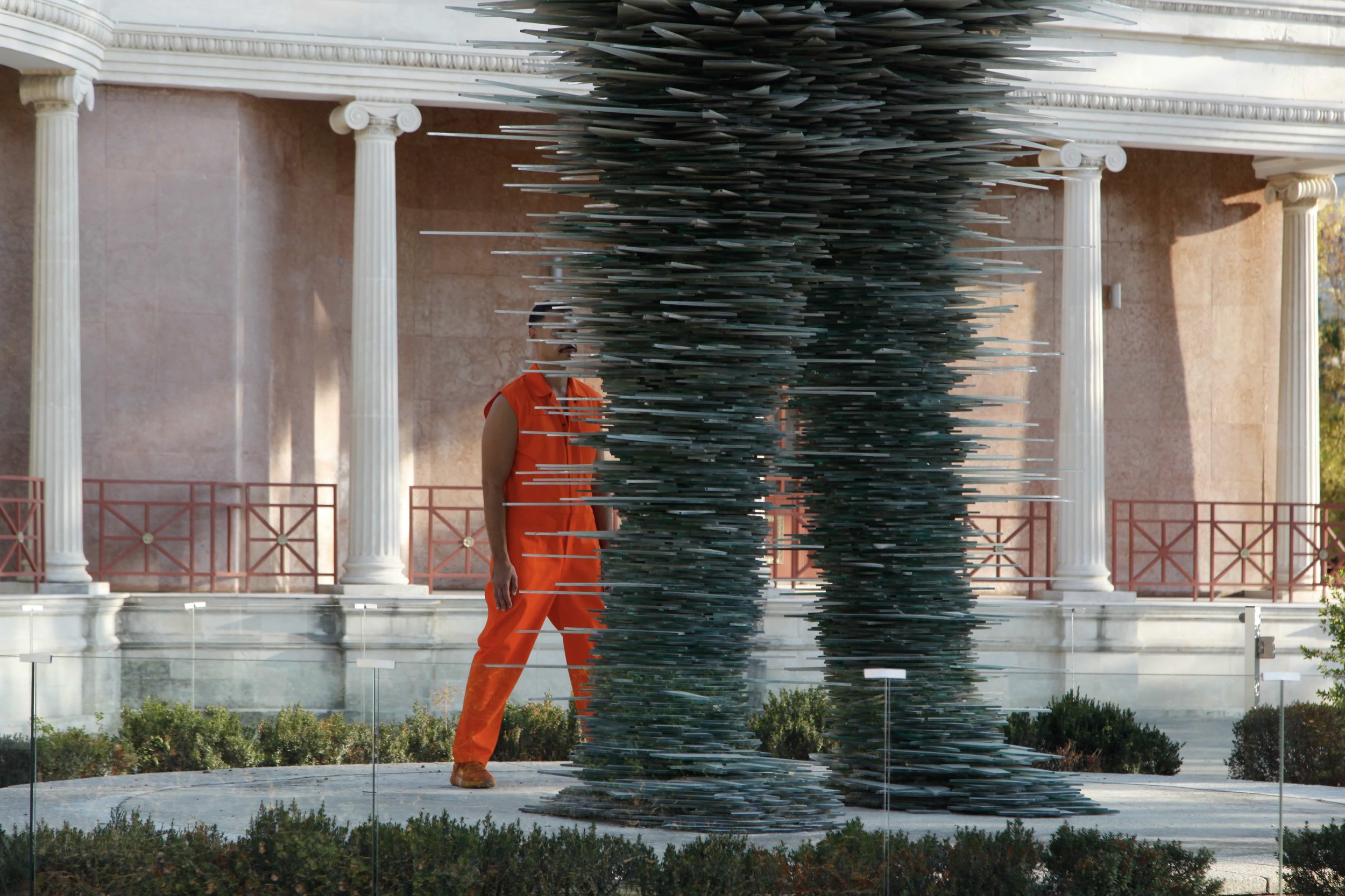 MeP: The selection of works was not based on a specific artistic movement or aesthetic approach. The exhibition features conceptual works such as Theodoulos' "Clepsydra", representational sculptures such as Ioannis Notaras' "The Liberty Monument", examples of folk art such as "Jaffa Orange" by Sevcan Çerkez, and even landmarks such as the "Big Potato", which some would not classify as 'art'.