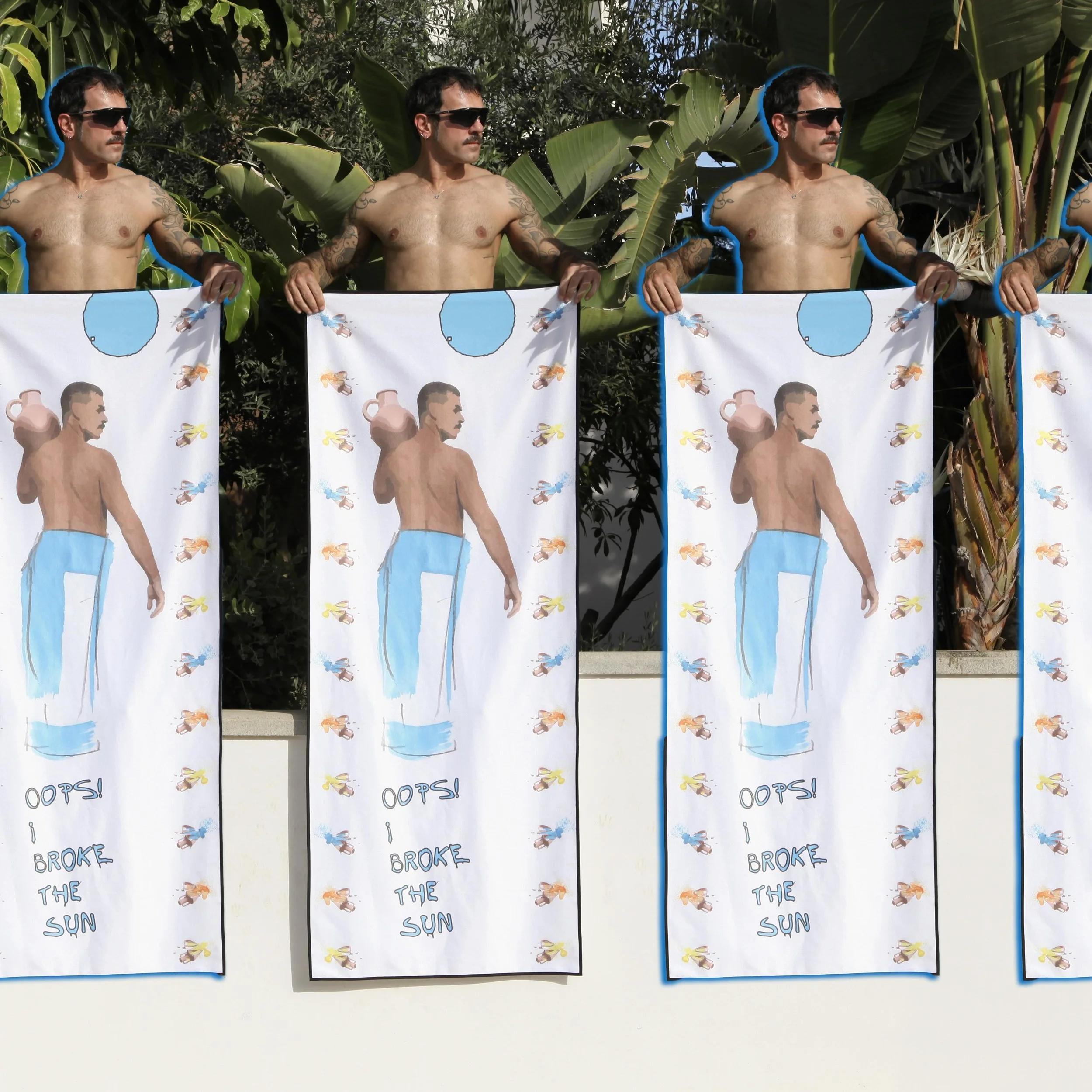 Series of beach towels created by visual artist PASHIAS, based on solo exhibition "Oops! I broke the sun" (Space for International Cooperation [SiC], Part of "Art Futures Fellowship 2025", Athens - GR, 2025)