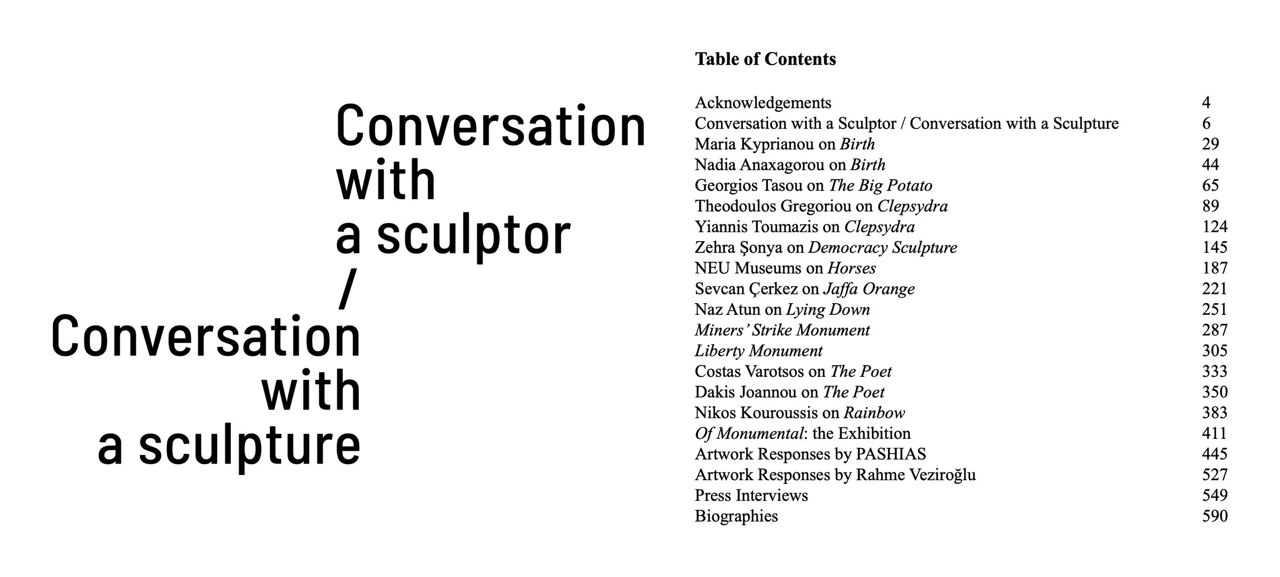 "Conversation with a sculptor / Conversation with a sculpture" is a research study and first-hand archive developed within the "Of Monumental" framework. Introduced by Dr. Dimitris Venizelos and Selin Genç, the publication examines eleven public art sculptures across the divide: "Birth" by Maria Kyprianou (2000, Limassol), "The Big Potato" (2021, Xylophagou), "Clepsydra" by Theodoulos Gregoriou (2009, Larnaca), "Democracy Sculpture" by Zehra Şonya (2019, Nicosia), "Horses" by the Near East University Sculpture Workshop (2021, Nicosia), "Jaffa Orange" by Sevcan Çerkez (2015, Lefke), "Lying Down" by Naz Atun (2021, Nicosia), "Miners’ Strike Monument" (2018, Lefke), "Liberty Monument" by Ioannis Notaras (1973, Nicosia), "The Poet" by Costas Varotsos (1983, Nicosia), and "Rainbow" by Nikos Kouroussis (1976, Nicosia) that was taken down later on.